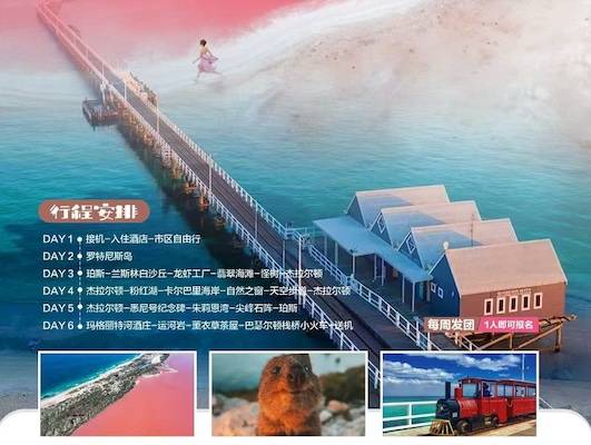 * 行程时间和顺序仅供参考,如果参团客人抵达珀斯的时间为周日,则行程顺序有所调整,请以当天实际情况为准。